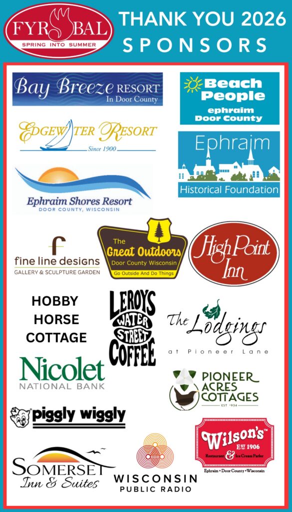 Celebrate the transition of spring into summer on the shoreline of Eagle Harbor at the 61st Fyr Bal Festival on June 20, 2026! Embrace Ephraim’s Scandinavian heritage with a family friendly, fun-filled day of music, dancing, crafts, and artisans. As the sun sets, a bonfire is lit to welcome the long days of summer. A fireworks display over Eagle Harbor brings the festival to a dramatic close leaving spectators excited to return next year.