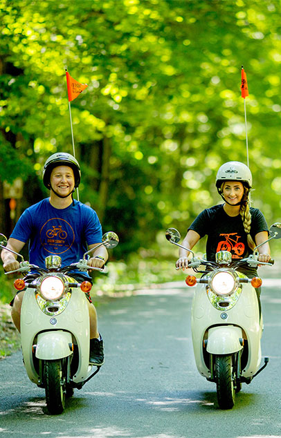 Located steps from Peninsula State Park trailheads, family owned Edge of Park offers a wide range of bicycle and moped rentals for all ages and abilities. Enjoy popular Sunset Bike Trail or scenic paved roads throughout the Park and surrounding County. Our experienced staff will ensure you find the best routes for you and your family. Rentals include a helmet, lock, map and backpack as well as easy parking and trail access to get you on your adventure in no time!